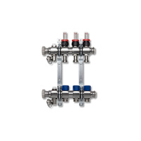 Rozdzielacz ze stali nierdzewnej z pomiarem i regulacją przepływu na zasilaniu. Wkładka termostatyczna na powrocie, uchwyt ścienny i zawór spustowy. 2