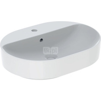 Umywalka GEBERIT Variform owalna, biała, 600mm, otwór na baterię na środku, stawiana na blat, z odpływem przelewowym, półka od ściany