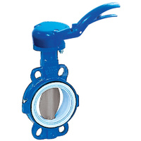 Przepustnica bezkołnierzowa SYLAX z napędem ręcznym dźwigniowym, dysk: AISI316, wykładzina: NBR, korpus: GGG40 epoksyd., Pnom 1,6 MPa, tmax=85 st.C DN100