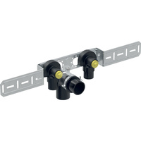 Kolanko przyłączeniowe Geberit FlowFit 90 st. wstępnie zamontowane, podwójne, z odsadzeniem, z zaciskiem rury odpływowej i kolanem odpływowym: Materiał=Brąz bezołowiowy (CuSn4Zn2PS), d=16mm, Rp=1/2 ", L1=5.2cm, AD=15.3cm