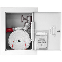 Hydrant DN 33 zawieszany z miejscem na gaśnice pod zwijadłem, wąż 30 m, ocynk fasada, zamek patent, RAL 9003
